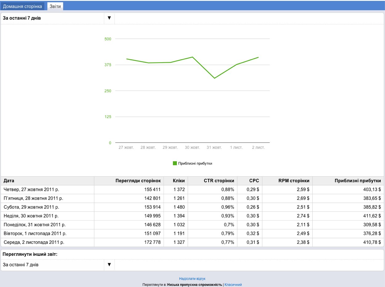 Коли ви використовуєте мобільний інтерфейс або версію для низької пропускної спроможності та переходите на вкладку домашньої сторінки, ви можете побачити приблизні прибутки й підсумки прибутків, швидкі посилання на стандартні та збережені звіти, а також сповіщення облікового запису. На вкладці "Звіти" можна знайти швидкі звіти (сукупні дані за 7 днів, 30 днів, поточний місяць, останній місяць) і ваші збережені звіти. На додачу тепер ви маєте більше статистичних даних про прибутки, оскільки можете бачити дані про перегляди сторінки, кліки, рейтинг кліків сторінки, ціну за клік, RPM і приблизні прибутки в таблиці під графіком прибутків.